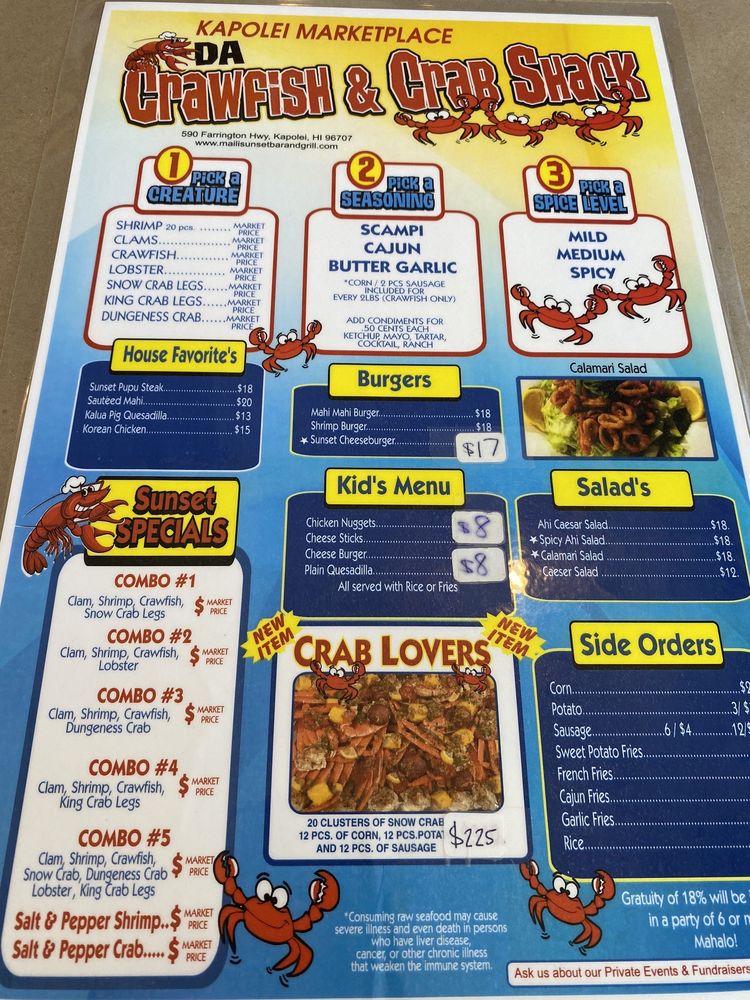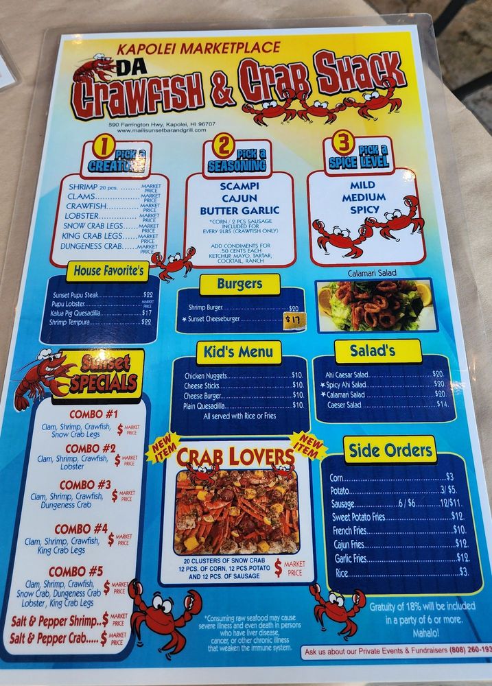 Da Crawfish and Crabshack is a popular Cajun/Creole restaurant located in Kapolei, HI. Known for its outstanding cajun sauce and a variety of seafood dishes, this restaurant offers a unique dining experience. Customers rave about the shrimp burger, spicy ahi bowl, and crab feast that are all packed full of flavor. With options for takeout, delivery, and catering, Da Crawfish and Crabshack caters to a wide range of diners. The casual atmosphere, friendly service, and spacious dining area make it a great spot for families, groups, or a date night. The menu offers a mix of seafood, burgers, and Cajun cuisine, with a full bar and happy hour specials. Overall, Da Crawfish and Crabshack is a must-visit for those craving delicious seafood dishes in a lively setting.